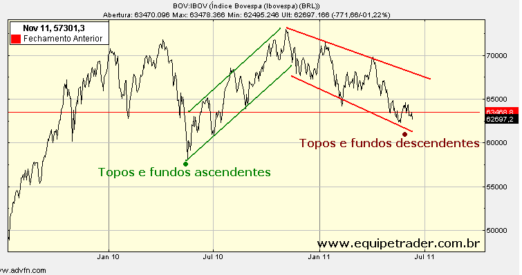De acordo com a análise gráfica, a bolsa de valores está em tendência de baixa, observe os topos e fundos descendentes sublinhados em vermelho, no gráfico acima. Os novos topos e fundos sempre são menores que os anteriores, é exatamente isso que indica uma tendência principal de baixa. Isso não significa necessariamente que você deve entrar em pânico e vender tudo, porém agora é o momento onde você deve rever sua estratégia e se perguntar. Vou precisar do dinheiro agora? A empresa que estou investindo, tem futuro? Certamente pra quem opera na bolsa de valores a longo prazo, está tendo uma boa oportunidade de comprar boas ações, a um preço muito bom, a bolsa em baixa não significa necessariamente que você deve sair e não voltar mais nas ações, muito pelo contrário, com a baixa dos preços muitas empresas boas ficam mais baratas e é nessa hora que devemos entrar.