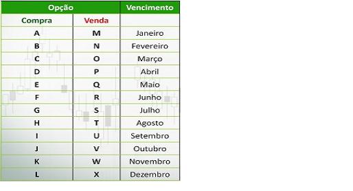 Exemplo: VALEC40 = Opção de compra da VALE5, que vence em Março, e valor de strike R$40,00.