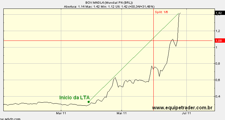 As ações da empresa Mundial com código de negociação (MNDL4 – Preferenciais, MNDL3 – Ordinárias) dispararam mais de 100% em pouquíssimo tempo, como podemos ver no gráfico, o início de sua LTA (Linha de Tendência de Alta) se deu aproximadamente em abril, quando o ativo passou a fazer fundos e topos ascendentes, após um grande período de lateralização onde houve pouca movimentação, tanto pra cima quanto pra baixo. Veja o gráfico a seguir: